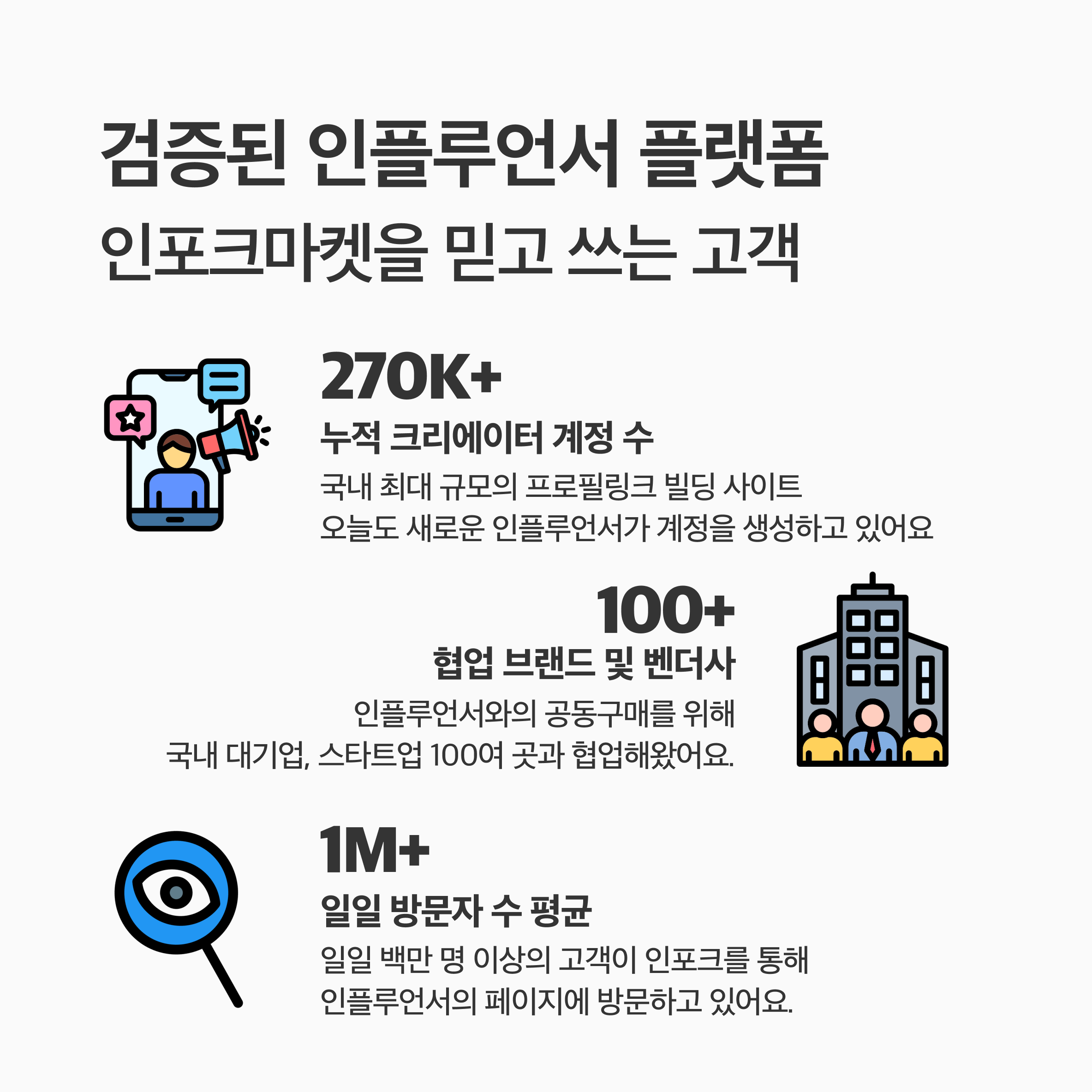 27만 명 이상의 인플루언서가 인포크 계정을 보유하고 있으며, 100곳 이상의 브랜드 및 벤더와 협업 중이고, 1만 개 이상의 브랜드 및 벤더사가 제안하기 서비스를 사용하여, 인포크와 공동구매 비즈니스를 진행했어요. 또한 하루 평균 방문자 수가 100만 명 이상을 기록해, 구매하게 될 고객 입장에서도 친숙한 서비스죠.